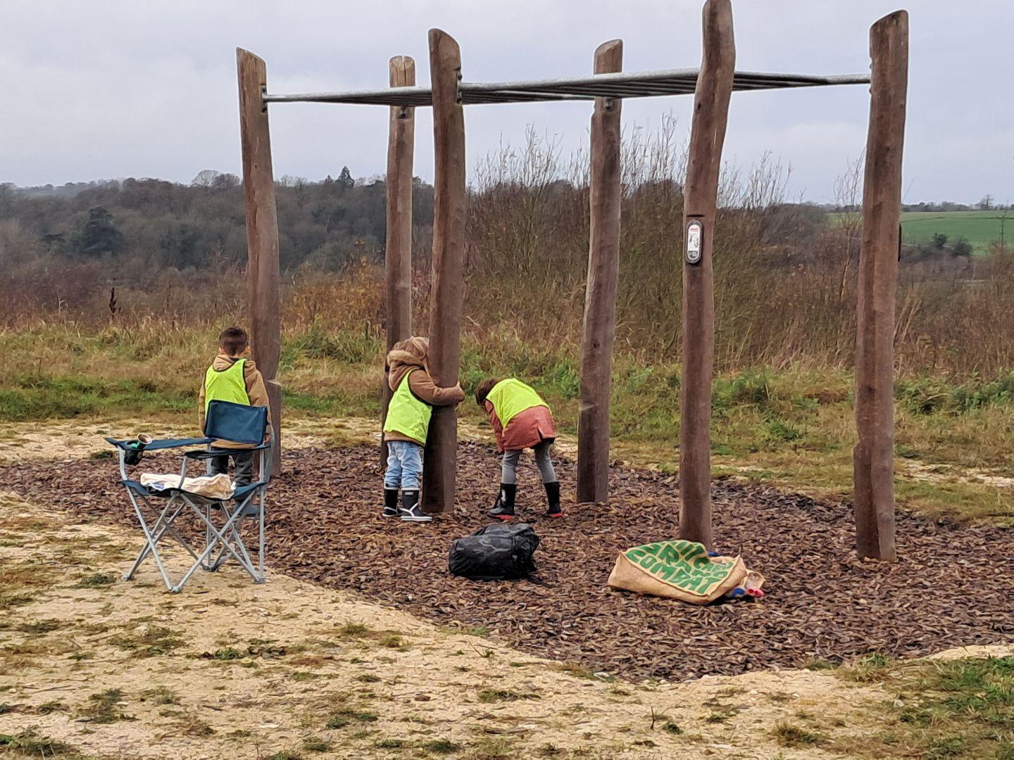 Ensuite, au programme de la matinée, différents temps ont été proposés, comme en classe : des temps d’activités (chasse au trésor : collecte d’éléments naturels), de regroupement (langage, lecture d’album), de récréation (long temps libre pour explorer : jouer à cache-cache, marcher dans les hautes herbes, jouer sur la structure)….