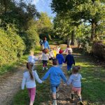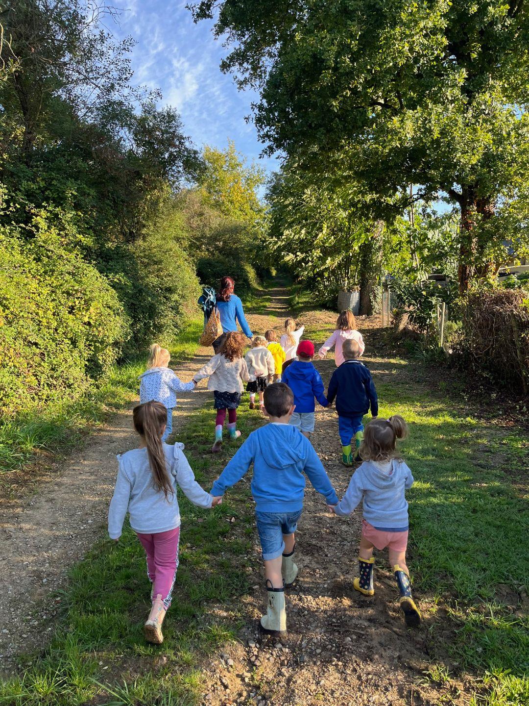 Cette année, les élèves de l’école maternelle découvrent l’école dehors. Après une vingtaine de minute de marche, ils atteignent le lieu de leur nouvelle école : : l’ancienne carrière à Entrammes